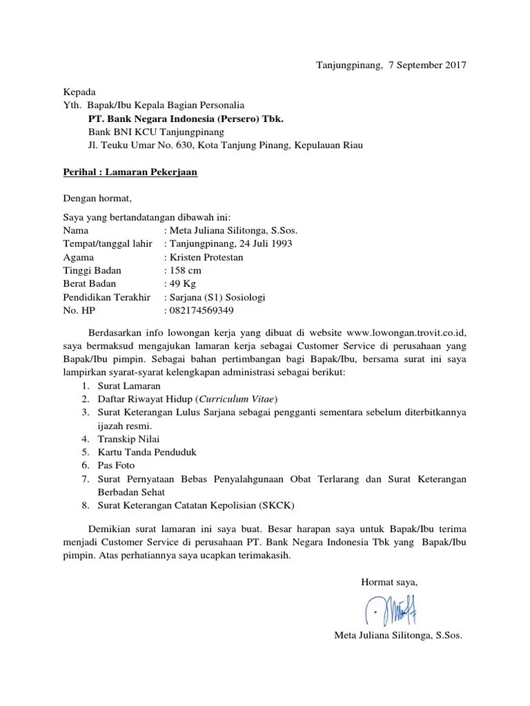 Pekanbaru, 17 oktober 2017 hal : Contoh surat lamaran kerja yang baik benar unik menarik resume bank perusahaan swasta negri pns restoran rumah makan format rumah sakit . Lamaran pekerjaan yth.bapak/ibu pimpinan di tempat dengan hormat, sebagaimana iklan yang dimuat dalam surat kabar online . Umumnya lamaran pekerjaan diberikan kepada perusahaan di mana kamu ingin bekerja. Contoh surat lamaran pekerjaan posisi: